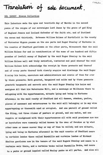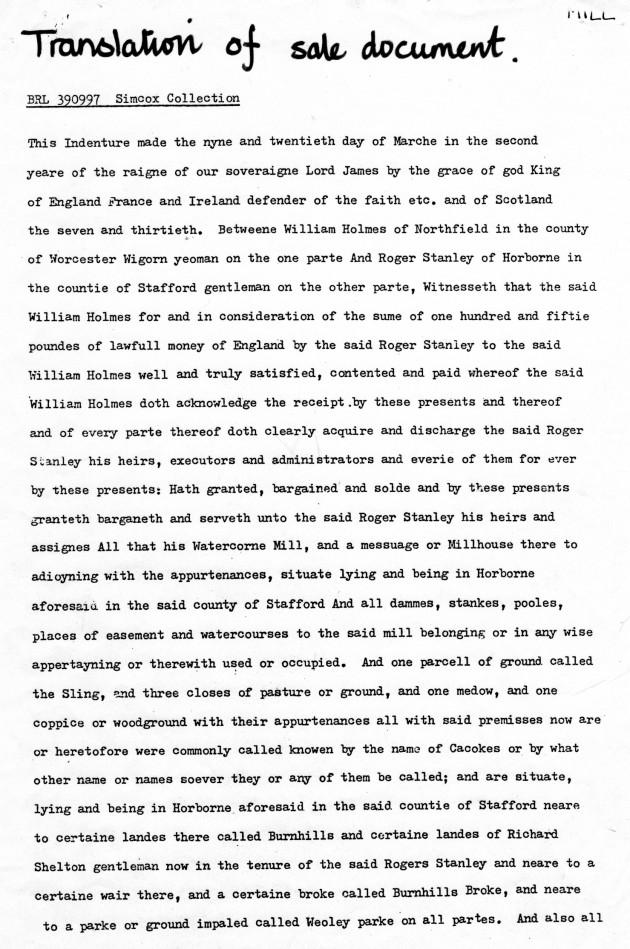 Copy of part of a sale document for Harborne Mill from 1605.