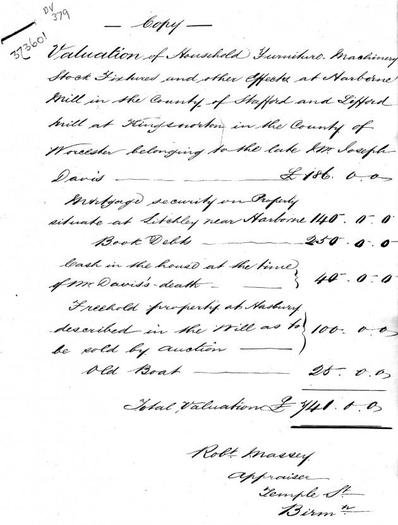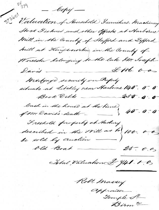 Valuation of household furnishing, stock in trade, Machinery and other …The property of the late Joseph Davis of Harbourne Mill in the parish of Harbourne and the county of Stafford. Taken for administration, this 20th day of november 1851 effects at Harbourne Mill in the county of Stafford. Six pairs of pillowcases, six pairs of bolsters, six pairs of… Suit of black, Greatcoat, Macintosh, two pairs of breachers, three pairs of shoes, 5 pairs of stockings, 7 shirts, Neckerchief,