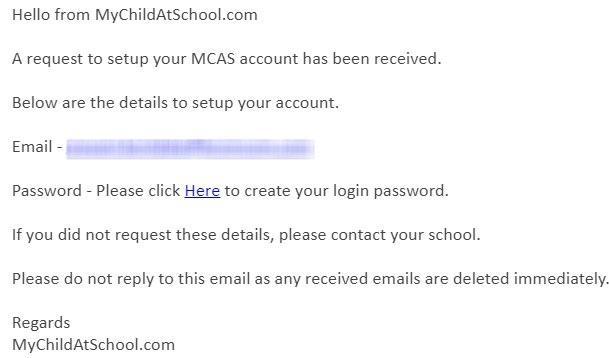 We will then email you a link to set up your MyChildAtSchool (MCAS) account.  (Please check your junk/clutter.)  The email will look something like this: